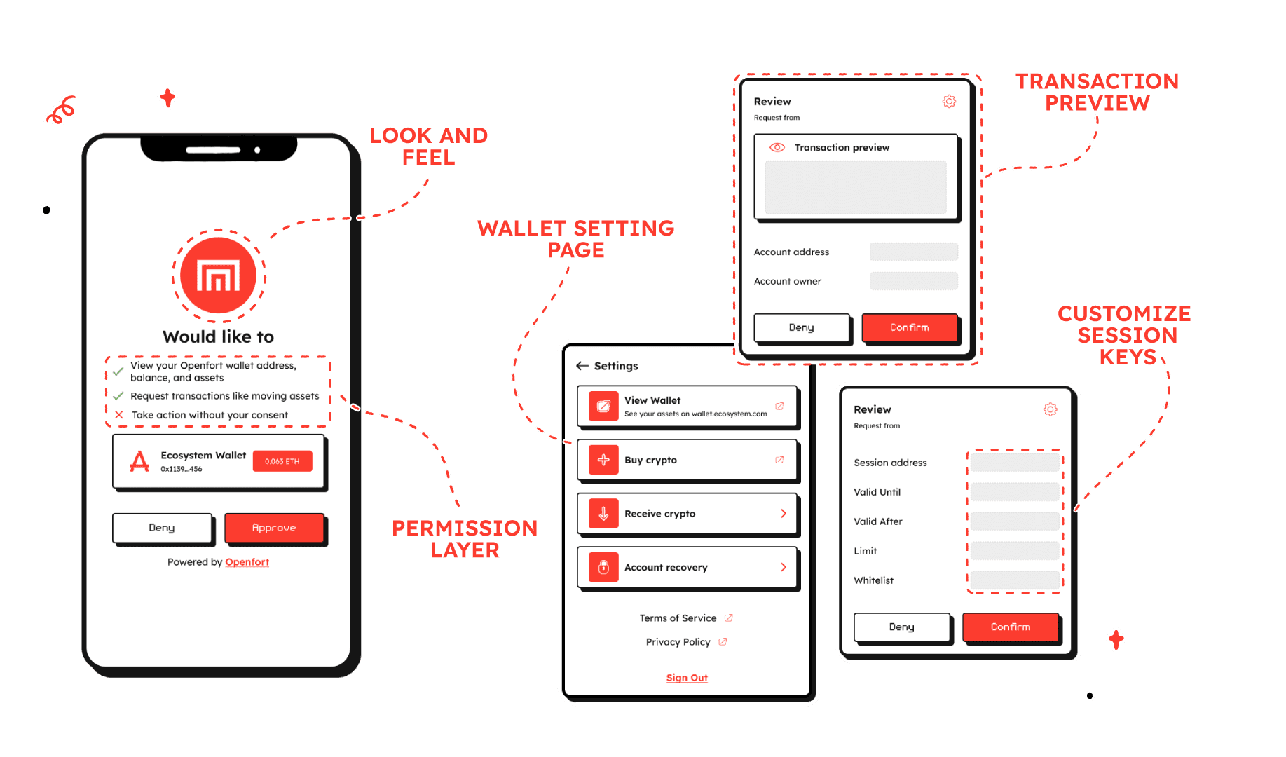 Openfort global wallets come with a default set of screens for authentication, session key confirmation, sign typed message, configuration, and transaction confirmation. These screens are designed to be customizable to fit your brand and user experience. Openfort provides helpers to the most popular frameworks to make it easier to integrate the global wallets.